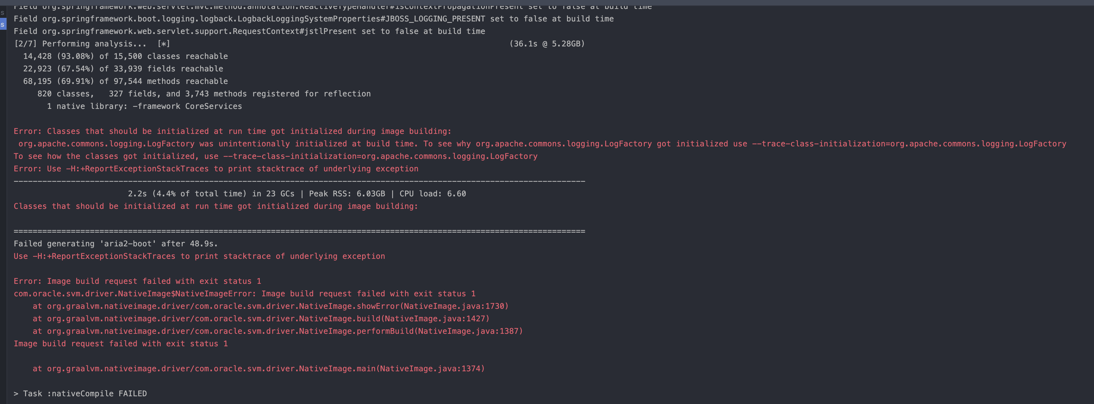 graalvmNative { binaries { main { buildArgs.add('--verbose') buildArgs.add("--initialize-at-build-time=org.apache.commons.logging.LogFactory") buildArgs.add("-H:ReflectionConfigurationFiles=$projectDir/reflection-config.json") } } }