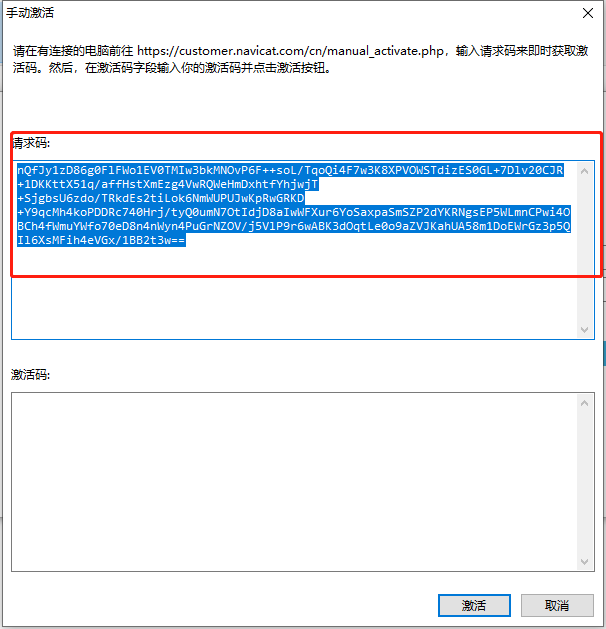 将注册机Activation Code处生成的激活码内容复制到Navicat手动激活窗口的激活码框中(或点击Activation Code处下面的Copy按钮),然后点击激活按钮:
