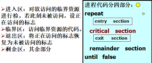 3)临界区:每个进程访问临界资源的那段代码叫临界区。为了正确同步,对临界区的代码要增加控制