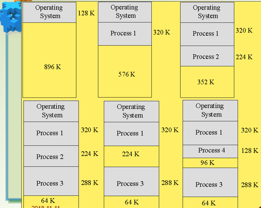 把内存分为一些大小相等或不等的分区,每个应用进程占用一个分区