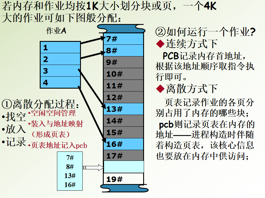 1)页面的概念:内存划分为多个小单元,每个单元k大小,成为块。作业也按k单位划分成片,称为页面。