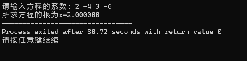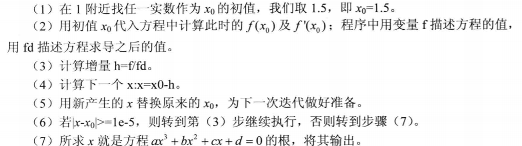 #include<bits/stdc++.h> int main() { float solution(float a, float b, float c, float d); float a, b, c, d, x; printf("ÇëÊäÈë·½³ÌµÄϵÊý£º"); scanf("%f %f %f %f", &a, &b, &c, &d); x=solution(a,b,c,d); printf("ËùÇ󷽳̵ĸùΪx=%f",x); } float solution(float a, float b, float c, float d) { float x0, x=1.5, f, fd, h; do{ x0=x; f=a*x0*x0*x0+b*x0*x0+c*x0+d; fd=3*a*x0*x0+2*b*x0+c; h=f/fd; x=x0-h; }while(fabs(x-x0)>=1e-5); return x; }