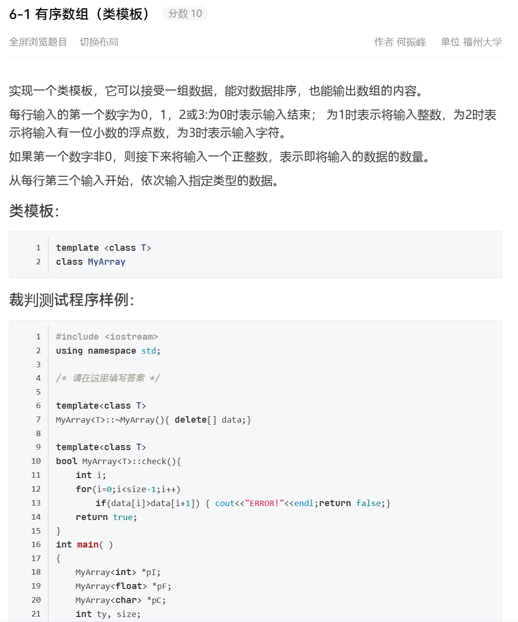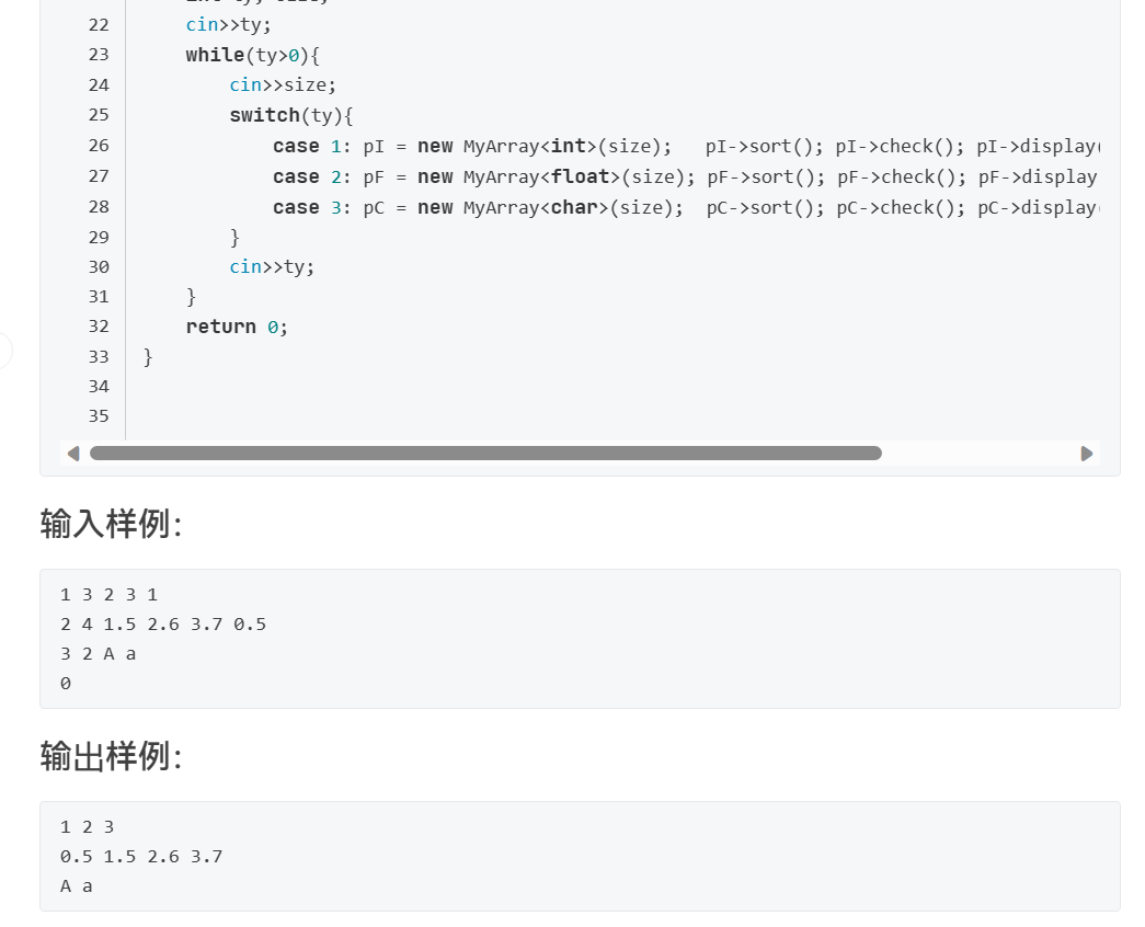 template<class T> class MyArray{ private: int size; T *data; public: MyArray(int s){ size=s; data=new T[size]; } void sort(){ int i,j,min; T t; for(i=0;i<size;i++) cin>>data[i]; for(i=0;i<size-1;i++){//选择排序 min=i; for(j=i+1;j<size;j++) if(data[j]<data[min]) min=j; t=data[i]; data[i]=data[min]; data[min]=t; } } void display(){ for(int i=0;i<size;i++){ cout<<data[i]; if(i!=size-1) cout<<" "; } cout<<endl; } bool check(); ~MyArray(); };