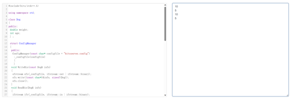 #include<bits/stdc++.h> using namespace std; class Dog { public: double weight; int age; } ; struct ConfigManager { public: ConfigManager(const char* configfile = "bitsserver.config") :_configfile(configfile) { } void WriteBin(const Dog& info) { ofstream ofs(_configfile, ifstream::out | ifstream::binary); ofs.write((const char*)&info, sizeof(Dog)); ofs.close(); } void ReadBin(Dog& info) { ifstream ifs(_configfile, ifstream::in | ifstream::binary); ifs.read((char*)&info, sizeof(Dog)); ifs.close(); } void WriteText(const Dog& info) { ofstream ofs(_configfile); ofs << info.age << endl; ofs << info.weight << endl; ofs.close(); } void ReadText(Dog& info) { ifstream ifs(_configfile); ifs >> info.age; ifs >> info.weight; ifs.close(); } private: string _configfile; }; int main() { ConfigManager cfgMgr; Dog dog1; Dog dog2; dog1.weight = 5; dog1.age = 10; //文本 cfgMgr.WriteText(dog1); cfgMgr.ReadText(dog2); cout << dog2.age << endl; cout << dog2.weight << endl; //二进制 cfgMgr.WriteBin(dog1); cfgMgr.ReadBin(dog2); cout << dog2.age << endl; cout << dog2.weight << endl; return 0; }