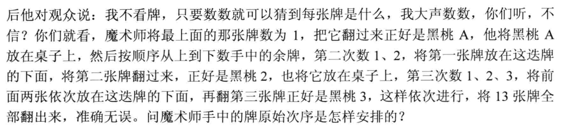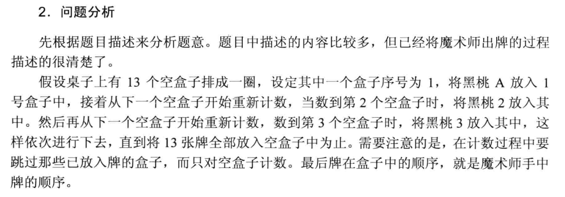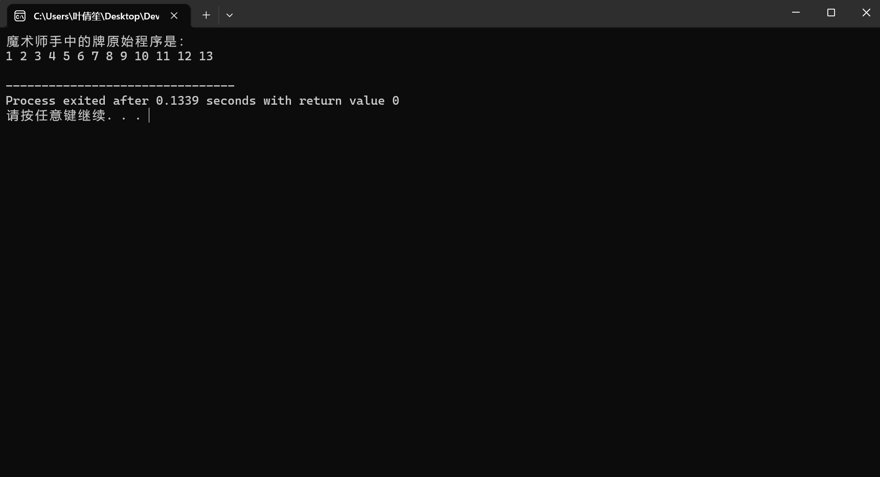 #include<bits/stdc++.h> using namespace std; int a[14]; main() { int i, j=1, n; printf("ħÊõʦÊÖÖеÄÅÆÔʼ³ÌÐòÊÇ£º\n"); for(i=1;i<=13;i++) { n=1; do { if(j>13) j=1; if(a[j]) j++; else { if(n==1) a[j]=i; j++; n++; } }while(n<=1); } for(i=1;i<=13;i++) printf("%d ", a[i]); printf("\n"); }