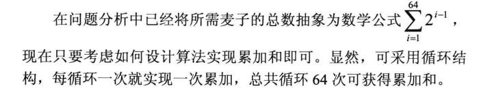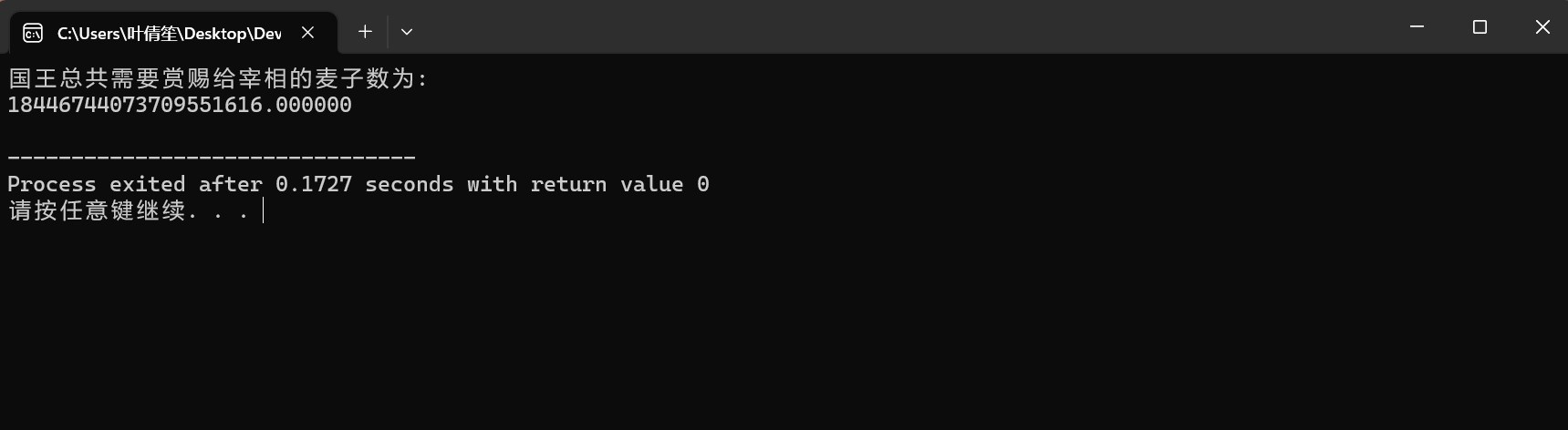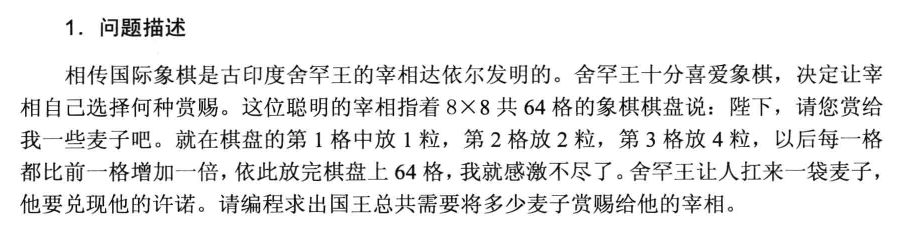 #include<bits/stdc++.h> using namespace std; main() { double sum = 0; int i; for(i=1;i<=64;i++) sum = sum + pow(2,i-1); printf("国王总共需要赏赐给宰相的麦子数为: \n%f\n", sum); }