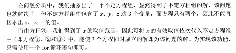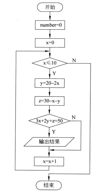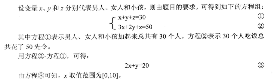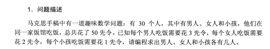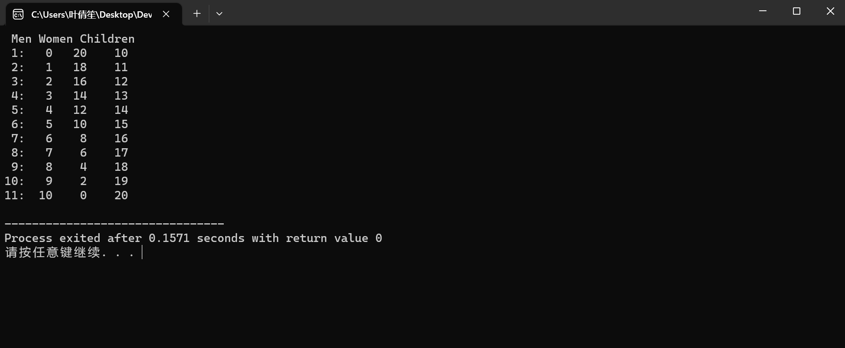 #include<bits/stdc++.h> using namespace std; main() { int x, y, z, num=0; printf(" Men Women Children\n"); for(x=0;x<=10;x++) { y=20-2*x; z=30-x-y; if(3*x+2*y+z == 50) printf("%2d:%4d%5d%6d\n", ++num,x,y,z); } }