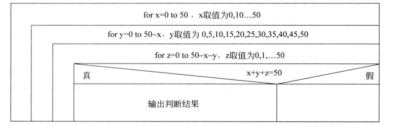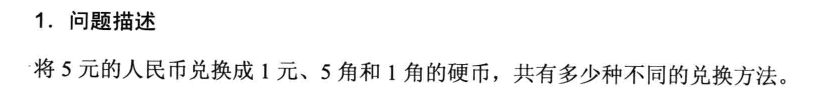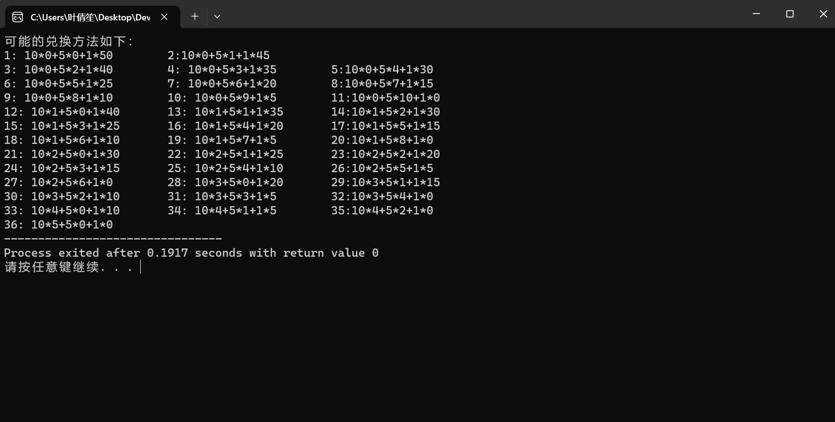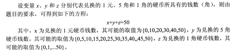 #include<bits/stdc++.h> using namespace std; main() { int x, y, z, count=1; printf("可能的兑换方法如下:\n"); for(x=0;x<=50;x+=10) for(y=0;y<=50-x;y+=5) for(z=0;z<=50-x-y;z++) if(x+y+z == 50) { printf(count%3?"%d: 10*%d+5*%d+1*%d\t":"%d:10*%d+5*%d+1*%d\n", count++,x/10,y/5,z); } }