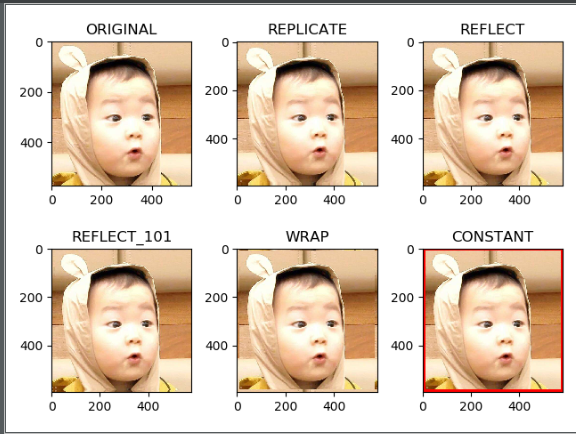 1 import cv2 2 import numpy as np 3 from matplotlib import pyplot as plt 4 5 RED=[255,0,0] 6 8 img1=cv2.imread('../image/min.jpg') 9 10 # BGR转成RGB矩阵 11 img1 = img1[:, : ,::-1] 12 13 replicate = cv2.copyMakeBorder(img1,10,10,10,10,cv2.BORDER_REPLICATE) 14 reflect = cv2.copyMakeBorder(img1,10,10,10,10,cv2.BORDER_REFLECT) 15 reflect101 = cv2.copyMakeBorder(img1,10,10,10,10,cv2.BORDER_REFLECT_101) 16 wrap = cv2.copyMakeBorder(img1,10,10,10,10,cv2.BORDER_WRAP) 17 constant= cv2.copyMakeBorder(img1,10,10,10,10,cv2.BORDER_CONSTANT,value=RED) 18 19 plt.subplot(231),plt.imshow(img1,'gray'),plt.title('ORIGINAL') 20 plt.subplot(232),plt.imshow(replicate,'gray'),plt.title('REPLICATE') 21 plt.subplot(233),plt.imshow(reflect,'gray'),plt.title('REFLECT') 22 plt.subplot(234),plt.imshow(reflect101,'gray'),plt.title('REFLECT_101') 23 plt.subplot(235),plt.imshow(wrap,'gray'),plt.title('WRAP') 24 plt.subplot(236),plt.imshow(constant,'gray'),plt.title('CONSTANT') 25 plt.show()