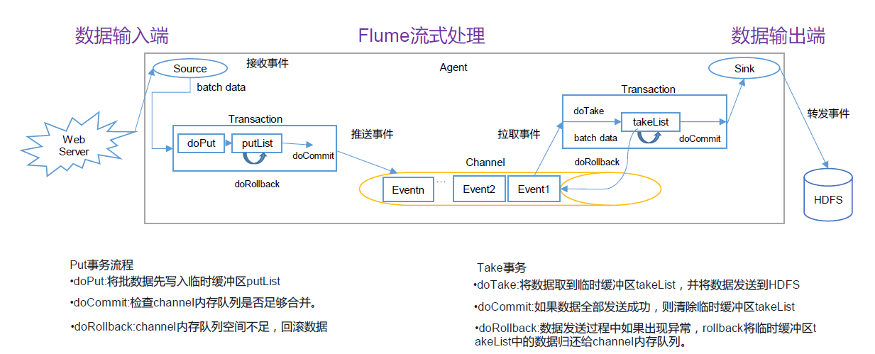 - Source负责收集数据到flume,可以处理各种数据类型:TAILDIR、avro、exec、spooldir、netcate