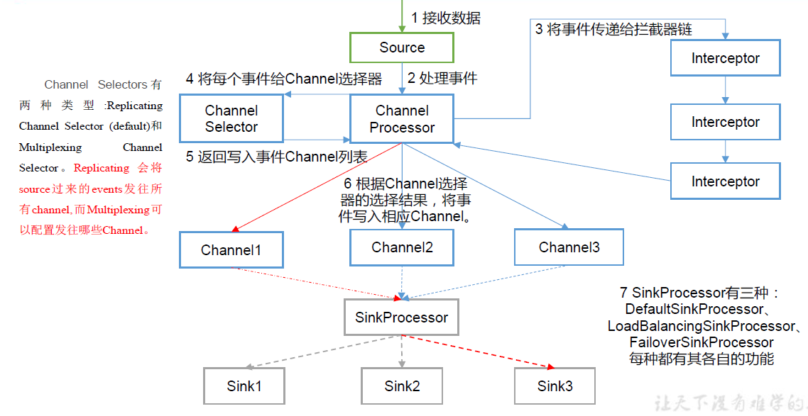 - 多路复用,需要配置source的Interceptor,Selector,根据body的内容进入不同的channel,sink