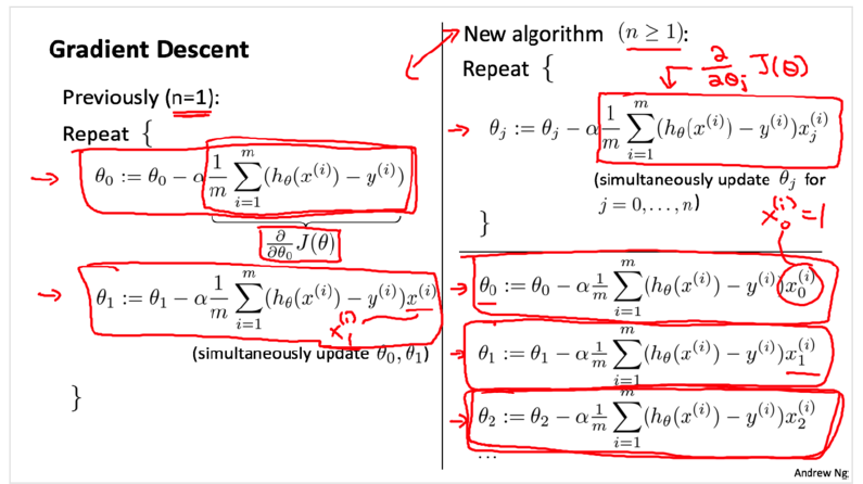 因为多变量线性回归的代价函数是凸函数,所以有最优解,令其每一个theta在所有数据集上的导数等于0,可得其解