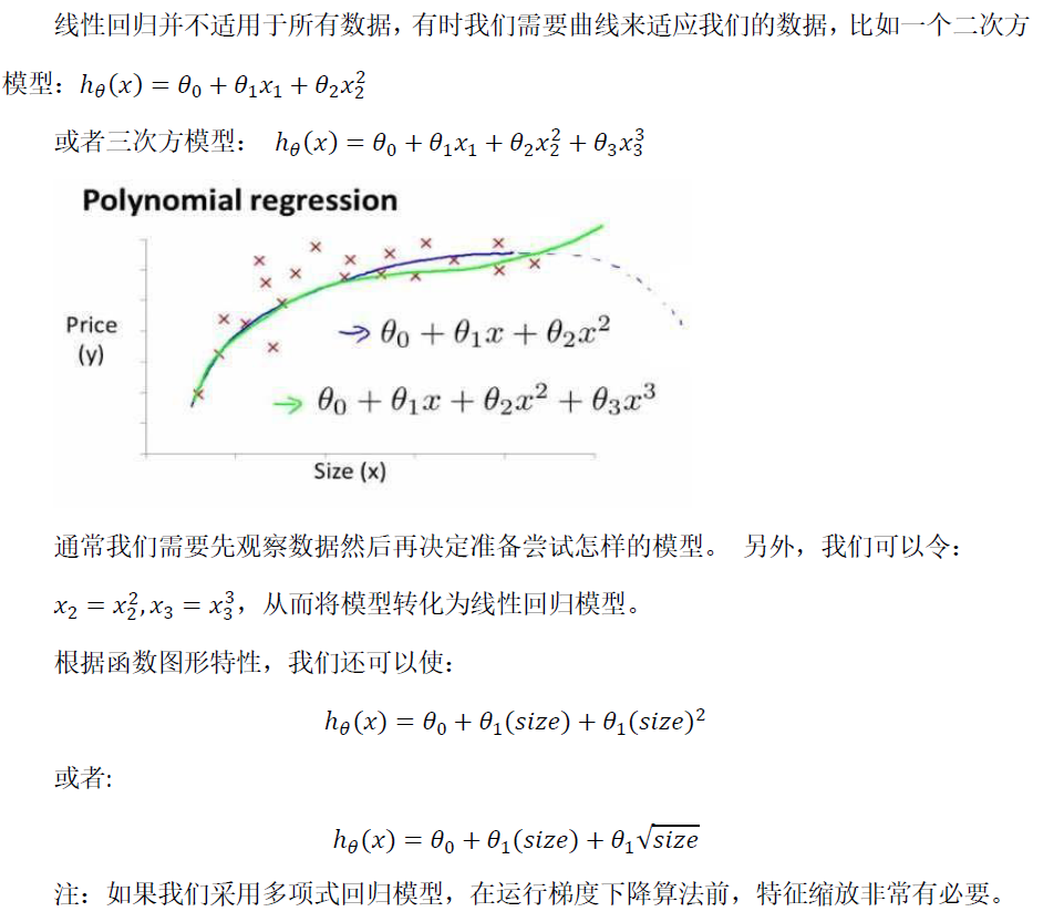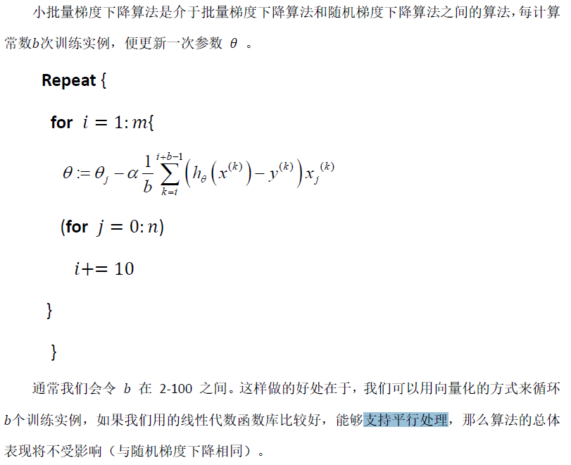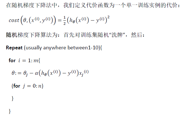 当训练集很大时,可以尝试随机梯度下降SGD代替批量梯度下降BGD,1>将所有数据随机打乱,2>对每一个数据进行梯度下降,也即是每次只使用一个数据进行梯度下降。3> 通常这样从头到尾重复1-10次(根据训练集的大小而定)。这样的问题是并不是每一步都是朝着正确的方向迈出的,因此,虽然算法会走向全局最小值的位置,但是无法站在最小值那一点,而是在附近徘徊。