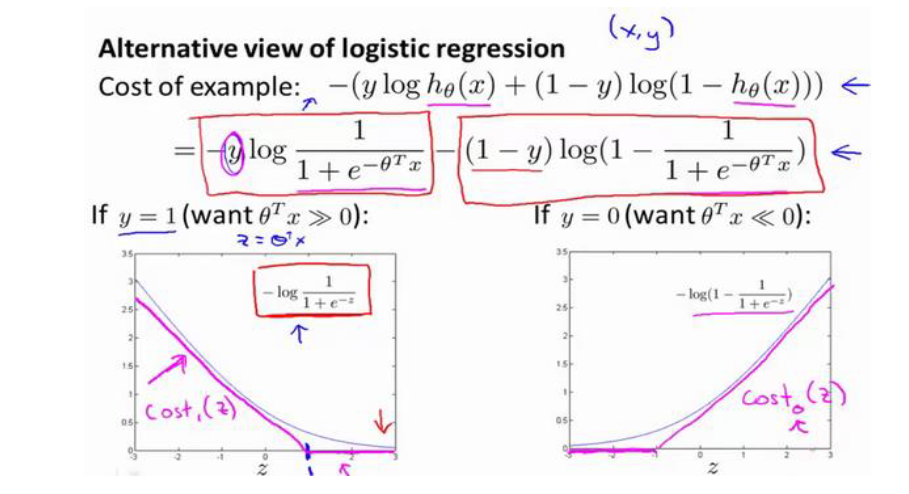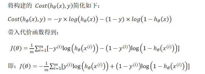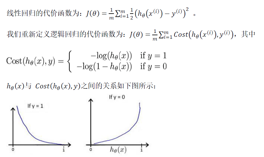 如果用线性回归中的代价函数,则由于假设函数的变化,代价函数是一个非凸的函数,定义新的代价函数,是一个凸函数