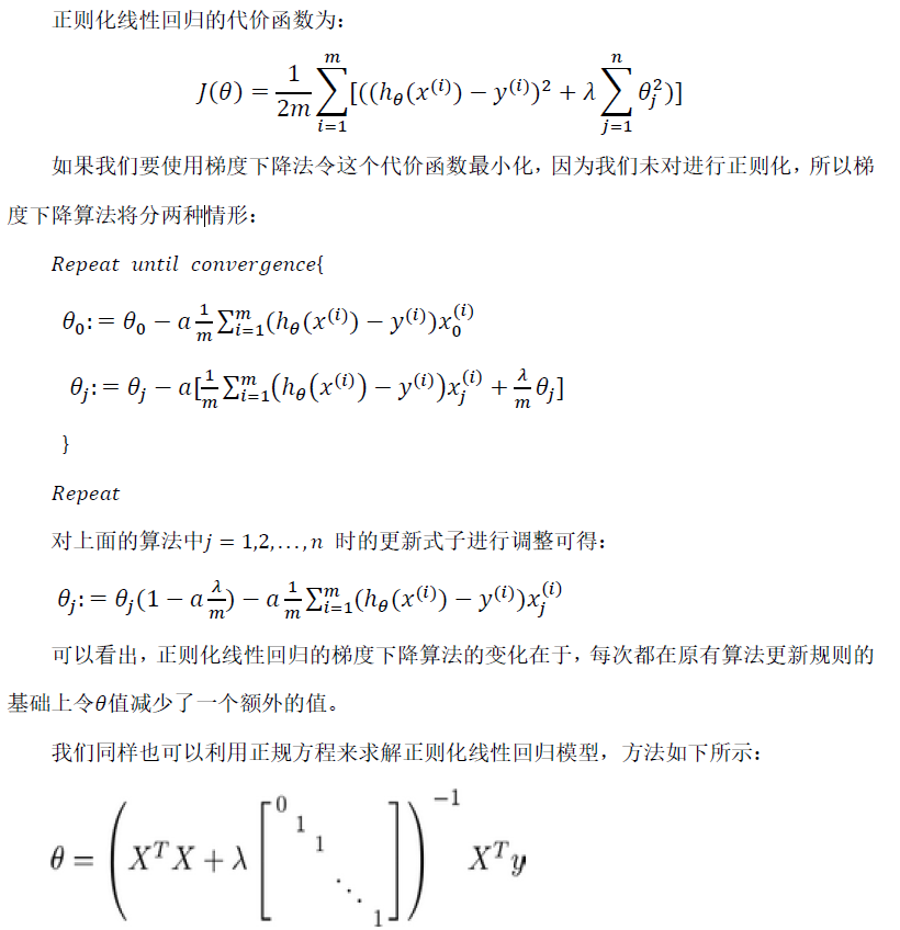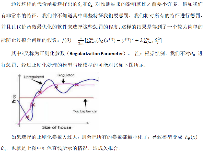 因为如果我们令𝜆 的值很大的话,为了使 Cost Function 尽可能的小,所有的 𝜃 的值(不包括 𝜃0)都会在一定程度上减小。