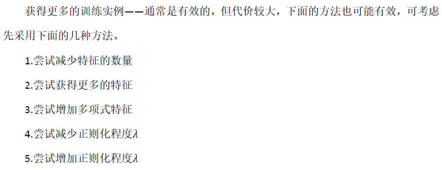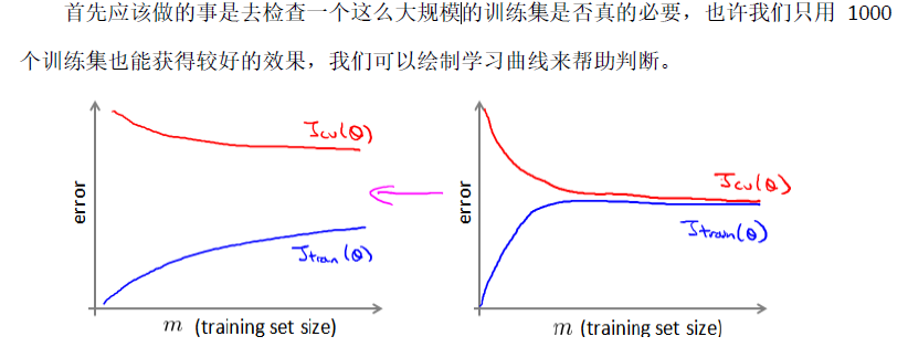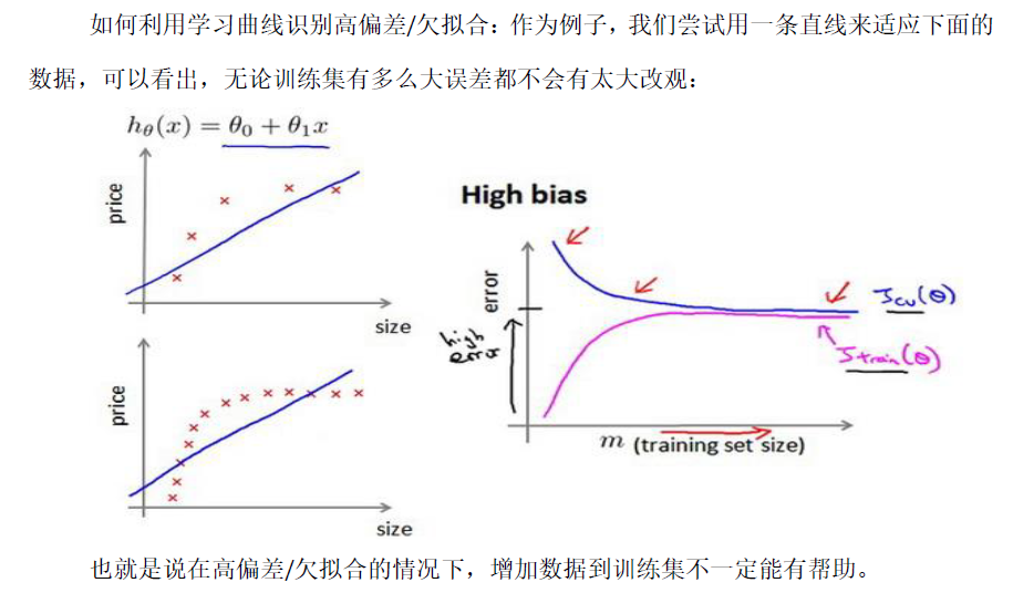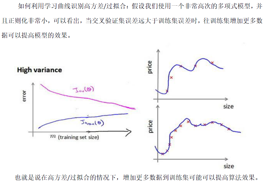 学习曲线,高偏差/欠拟合时,增加训练数据集没有什么效果;高方差/过拟合时,增加训练数据集可以提高算法效果。