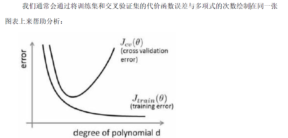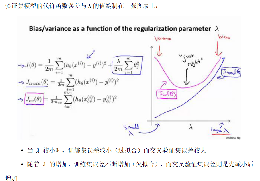 正则化防止过拟合,lambda小时欠拟合,大时欠拟合,交叉验证集误差先减小后增大。选择交叉验证集最小的时候的值