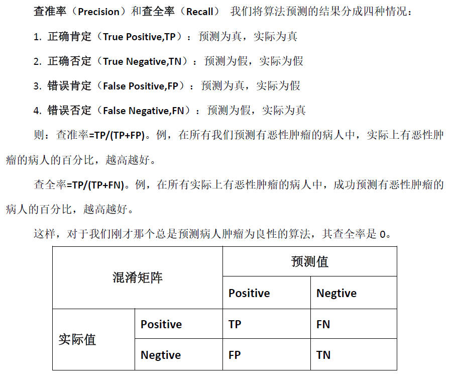 查准率和查全率,查准率分母是所有预测为真的样本,表示预测为真并正确的样本在预测为真的样本中的比例;查全率分母是实际为真的样本,表示预测为真并正确的样本中在实际为真的样本中的比例。
