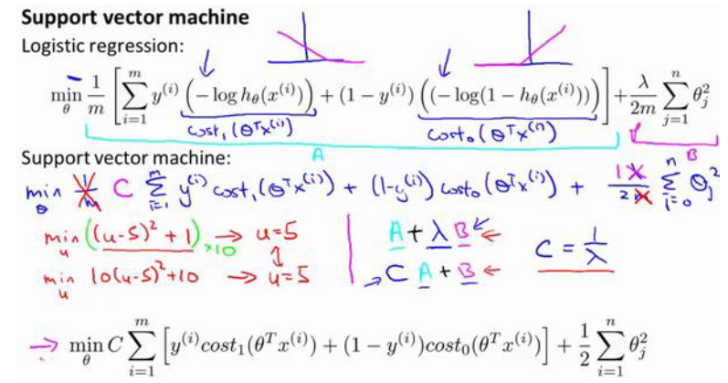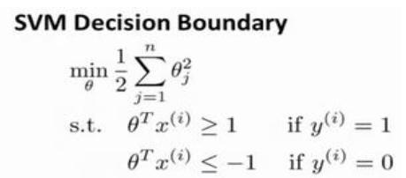 相比于逻辑回归的代价函数,SVM的代价函数在theta*x>1或小于-1时代价为0,也即是对于预测而言,他们都是肯定是正或负,不是概率,而仅仅要求theta*X>0 我们就判定它为正,但在代价函数中却要求它大于1,相当于在SVM中嵌入了一个额外的安全因子,或者说安全的间距因子。
