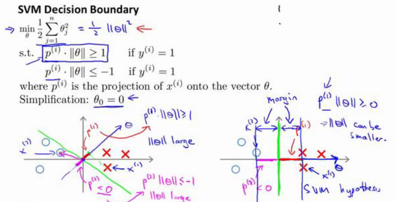 当C非常大时,SVM的代价函数努力是正则化项变小,也即是使theta的二范数(长度)变小,决策边界如下。那么x在theta上的投影p就需要变大,那么分类器的法线就会向类中心靠拢,以使得投影p变大,theta最小。那么就导致最终的分类参数对于各类是最大间隔的。