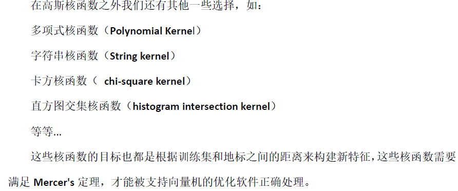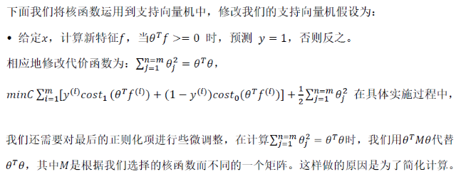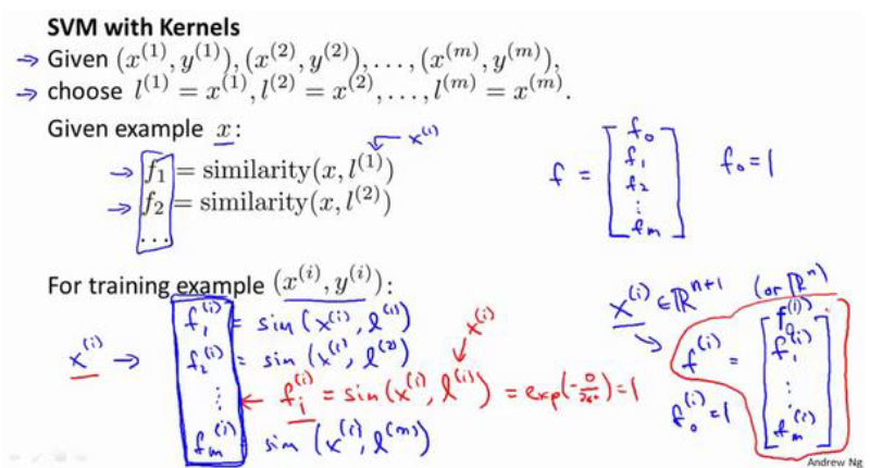 在以上SVM中,如何选择特征呢?答案是使用核函数。核函数是将原训练集的每一个训练样本映射到另外一个训练样本。映射方法是使用核函数计算相似度,计算相似度的对象是每一个训练样本。设有m个训练样本作为地标(landmark),那么参数就是m+1个(包含截距theta0)。计算每一个样本到地标的相似度作为新的特征,这样还是有m个样本,每个样本有m个特征(或加上x0=1)。核函数的思想是包含了一个样本距其他样本的所有距离,每个距离时样本的一个特征,距离它自己是1(高斯核函数)。然后应用到SVM中,