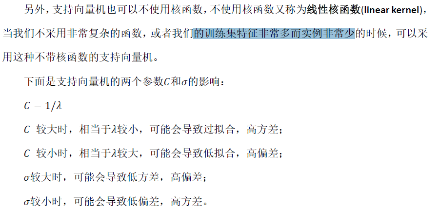当特征n非常多,训练集m非常少时,用线性核函数,也即是不使用和核函数,因为特征已经足够多了。