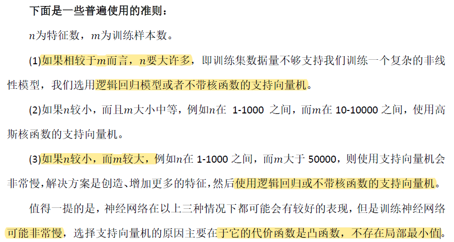逻辑回归和不带核函数的SVM的代价函数时凸函数,容易找到最优解,适用于特征较多,训练数据少和特征少,训练数据多的情况,因为特征较多时没有必要使用高斯核函数的SVM。而训练数据m多时,使用高斯核函数SVM会很慢。