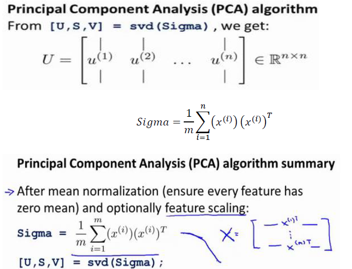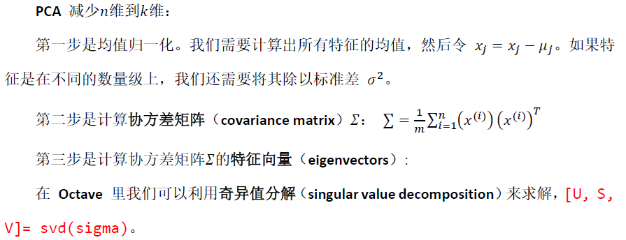 算法:1> 均值归一化,进行特征缩放;2> 计算协方差(向量表示1/m*x'*x);3> 计算协方差的特征向量(奇异值分解svd, 特征向量eig),根据需要进行降维,选取需要的特征向量,转置乘以原数据x得到降维后的特征z。这样做确实是使数据到一定维度的距离最小。