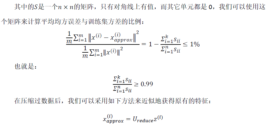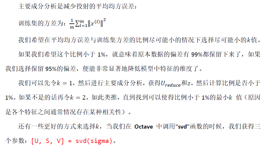 如何选取降维数k:从k等于1开始,计算平方误差占训练集方差的比例,表示被扔掉的信息比例,通常小于1%就可以了。也可以使用特征值计算。
