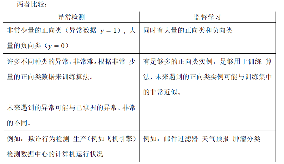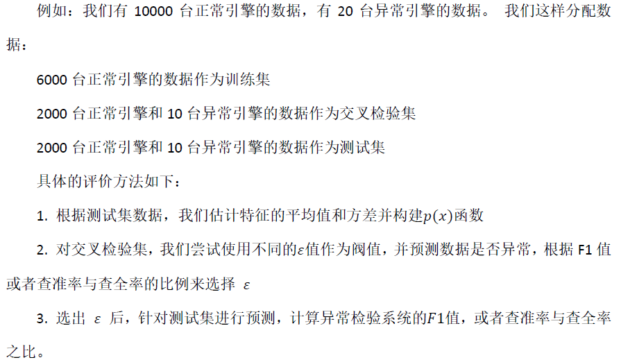 评估算法:异常检测是一种非监督学习算法,因此我们无法根据变量y来告诉我们数据是否真的异常。我们需要另外一种方法来帮助检验算法是否真的有效。从带有标记的数据着手,选取一部分作为训练集,剩下的正常数据和异常数据混合的构成交叉验证集和测试集。用训练集计算模型参数;用交叉验证集设置不同的epslon,计算TP,TN,FP,FN,计算F1score,选择比较大的;最后使用测试集进行预测,计算TP,TN,FP,FN,计算F1score。