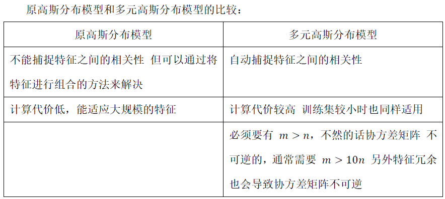 区别:多元高斯分布可以捕捉特征之间的联系,但是当特征很大时,计算代价很高(求逆,求行列式),而且必须要求数据集远大于特征数,才可以有效的拟合参数。