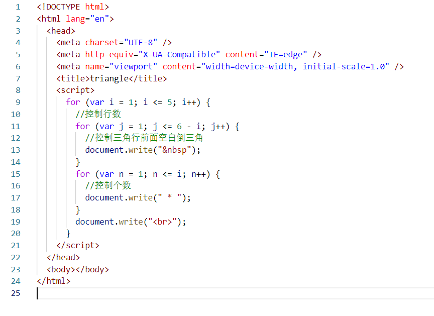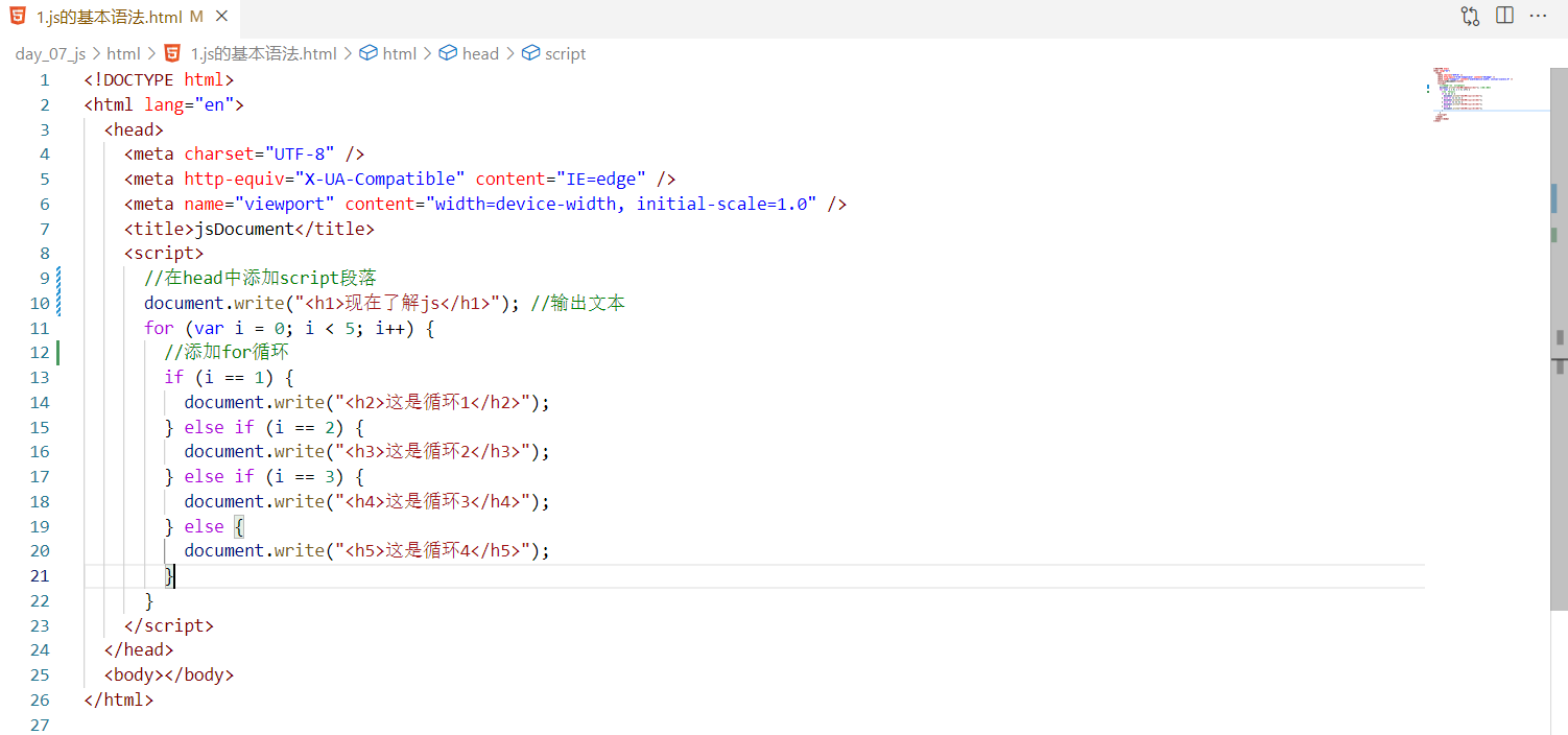 在html中,添加script段落,document.write("xx")为输出语句,并添加for循环,var为定义