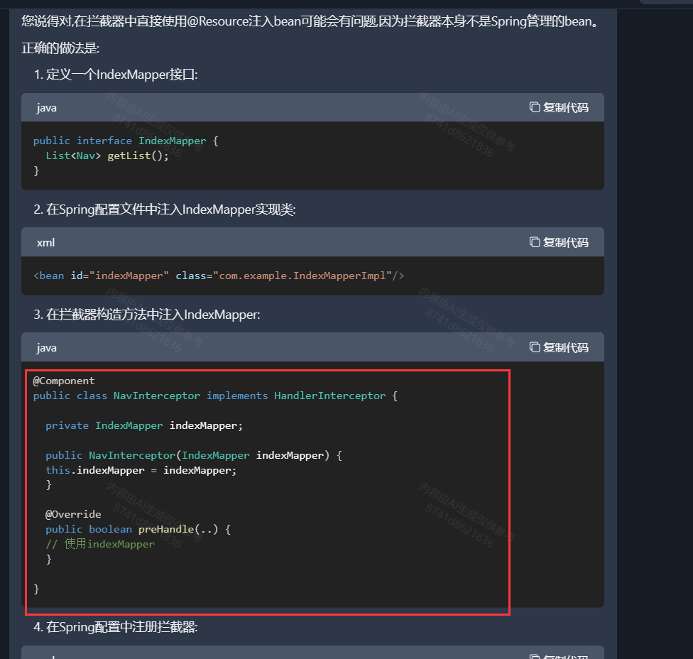 过滤器是受Spring管理的 可以直接注入 拦截器不行 需要给他在外层的配置给他注入进去Bean