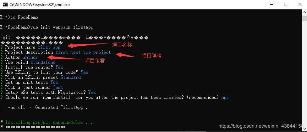 在命令行中运行命令 vue init webpack firstApp