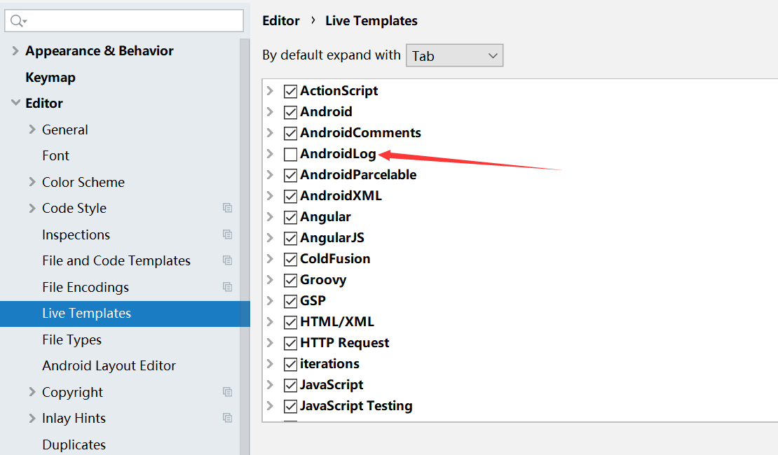 3、editor-live Templates 里 勾除 andirodLog,因为 有的话,使用时会出现andirod的用法,有两个挺烦的