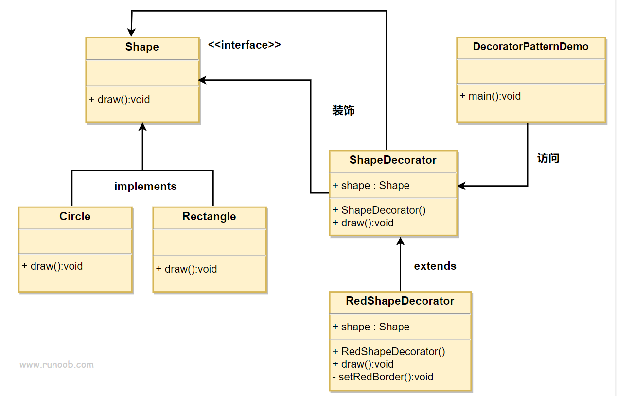 我们将创建一个 Shape 接口和实现了 Shape 接口的实体类。然后我们创建一个实现了 Shape 接口的抽象装饰类 ShapeDecorator,并把 Shape 对象作为它的实例变量。
