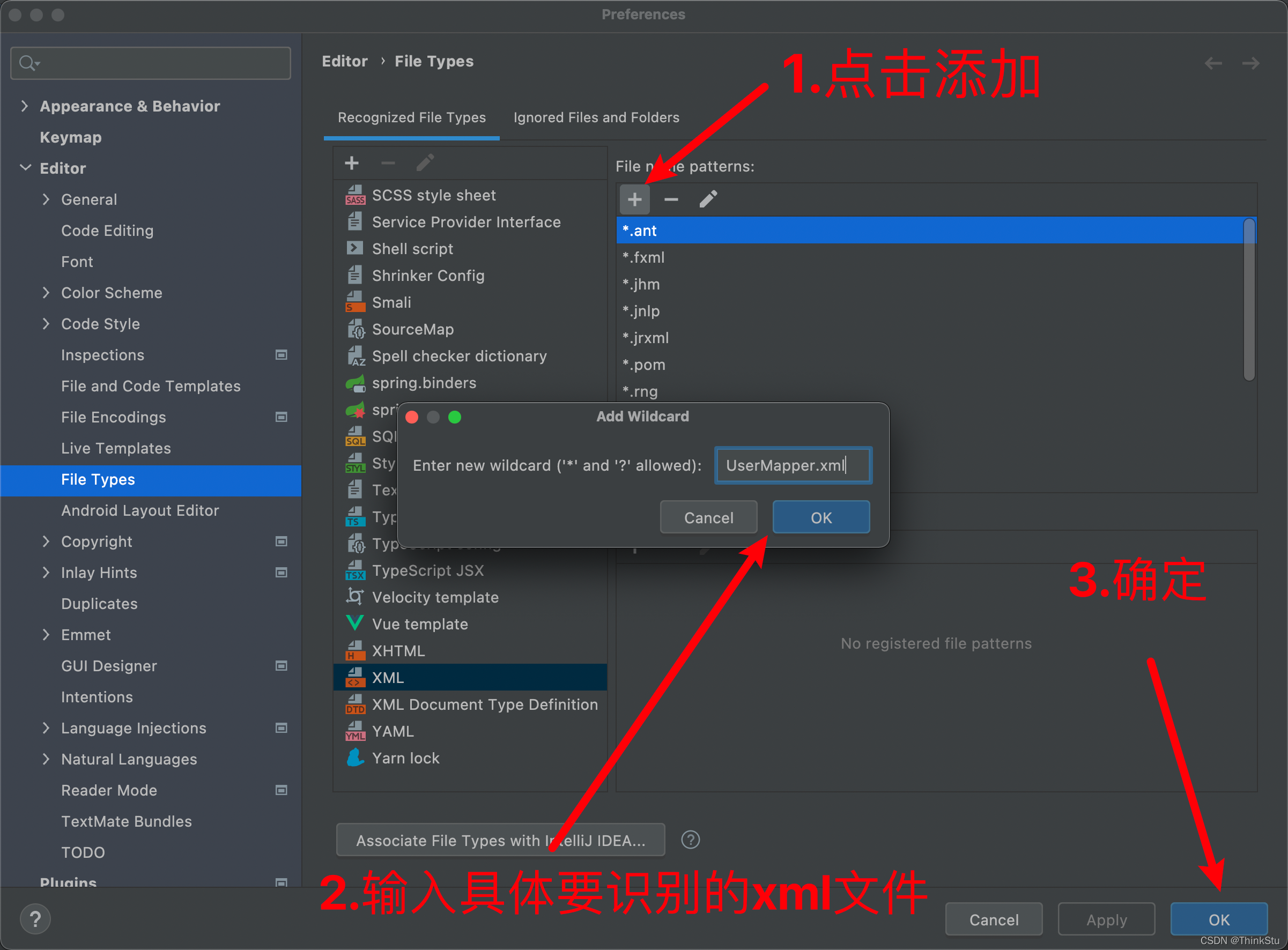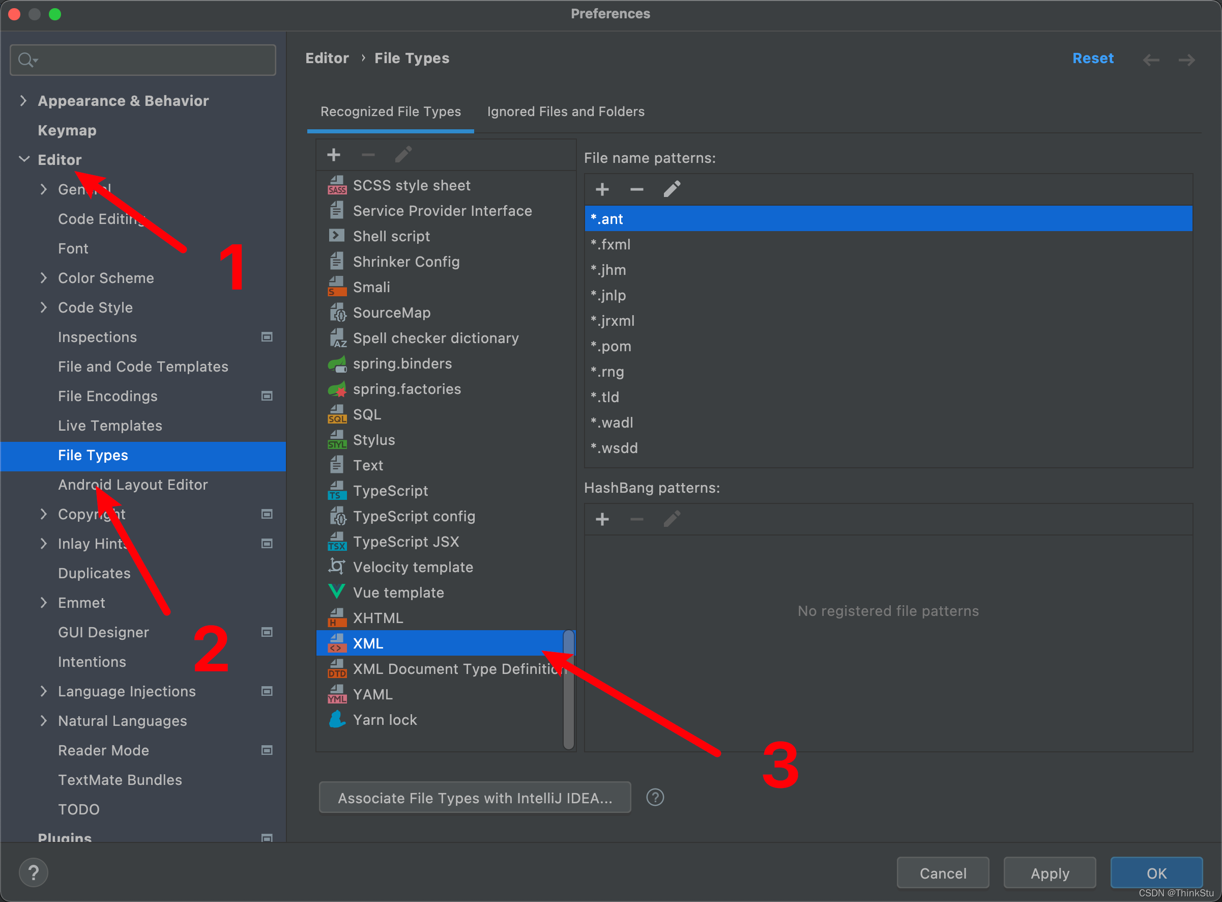 2. 选择 Editor → File Types(文件类型设置) → XML类型