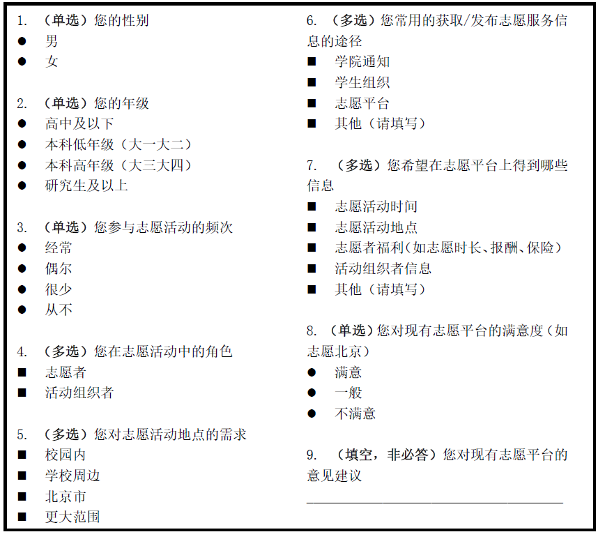 为了能够更加广泛地了解涉众对于志愿活动的报名和发布方面的需求以及他们对于现有志愿平台的改进建议及看法,我们小组设计了几个相关问题,并以问卷调查的形势散发给涉众,以期能够通过对涉众需求的进一步了解来对我们的志愿活动平台进行构思等方面的优化。