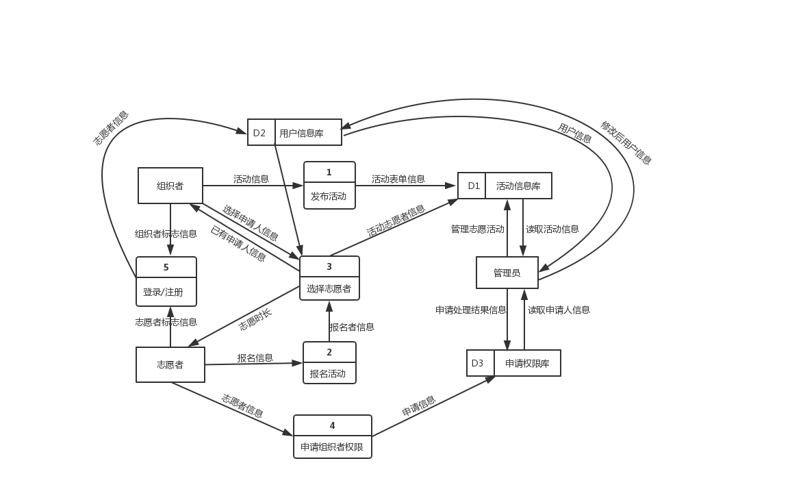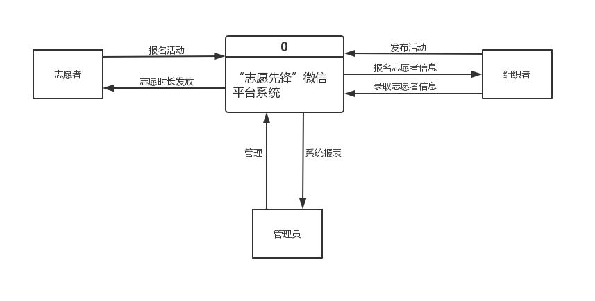 志愿活动组织者为提供志愿项目的人或组织,有发布志愿招募信息,筛选、招募志愿者,发放志愿时长,获取志愿者分类的需求。