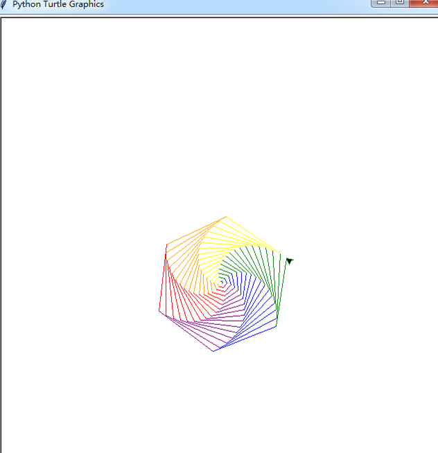 import turtle turtle.speed(10) colors = ['red','purple','blue','green','yellow','orange'] for i in range(100): turtle.pencolor(colors[i% 6]) turtle.forward(i) turtle.left(59) turtle.done()