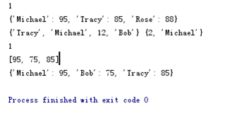 l = ['Michael','Bob','Tracy'] l.append('Bob') l.pop() print(1) t = ('Michael','Bob','Tracy') scores = [95,75,85] d = {'Michael':95,'Bob':75,'Tracy':85} d['Bob'] = 82 d['Rose'] = 88 d.pop('Bob') print(d) sl = {'Michael','Bob','Tracy'} s2 = {'Michael',2,3} sl.add(12) s2.remove(3) print(sl,s2) dl = dict(zip(l,scores)) print(1) print(scores) print(dl)