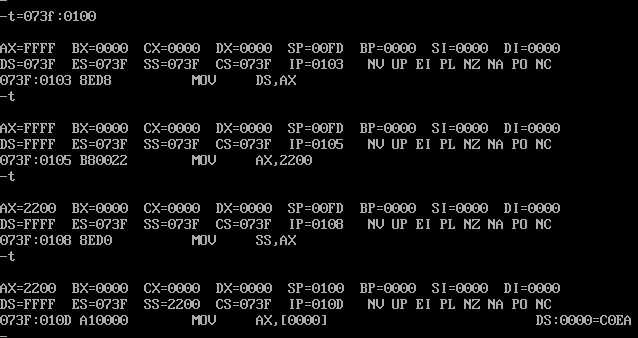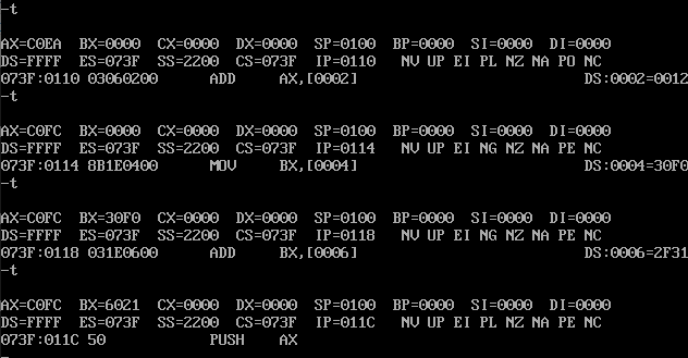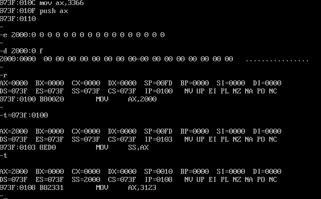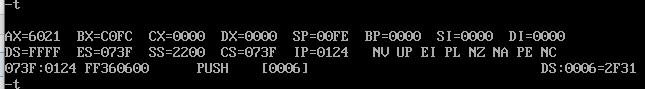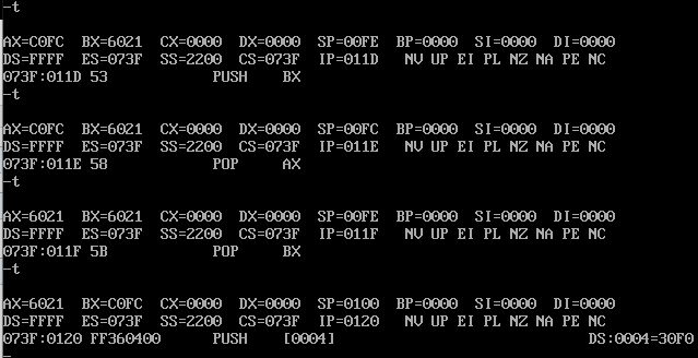 t是单步调试命令,当使用单步调试时,实际产生了单步中断。CPU会自动把一些值存放到栈中,这样就会把在程序里压入栈的值给覆盖掉。