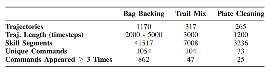 每个任务的训练后数据集中技能段和语言命令数量的总结。训练后数据集明显小于基础数据集--技能段的数量为基础数据集的4%-11%。