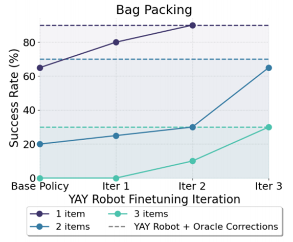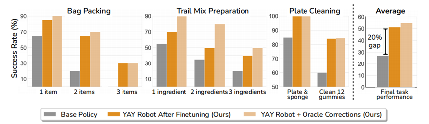 利用YAY技术调教后,机器人以更高的成功率挑战了物品装袋、水果混合和洗盘子这三项复杂任务。