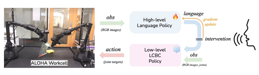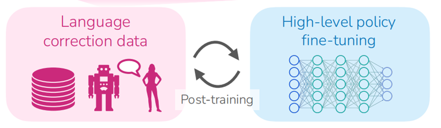 且在这个过程中命令会被系统记录并用于微调高级策略,通过学习人类提供的纠正性反馈,逐渐减少对即时口头纠正的依赖,从而提高长期任务的自主成功率。