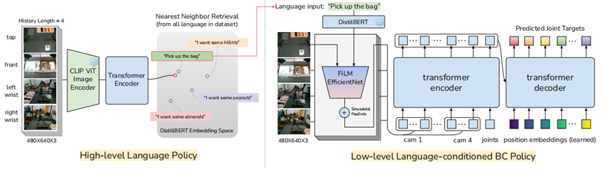 对于这样的任务,该系统提供了一个有意思的解决方案:YAYRobot(呀呀Robot)。该方案本质上是一个分层策略,上层策略根据观测obs的连续四帧图片,输出一个语言目标L_H;然后底层策略根据这个四帧图片+目标L_H,输出底层的动作(关节目标)。
