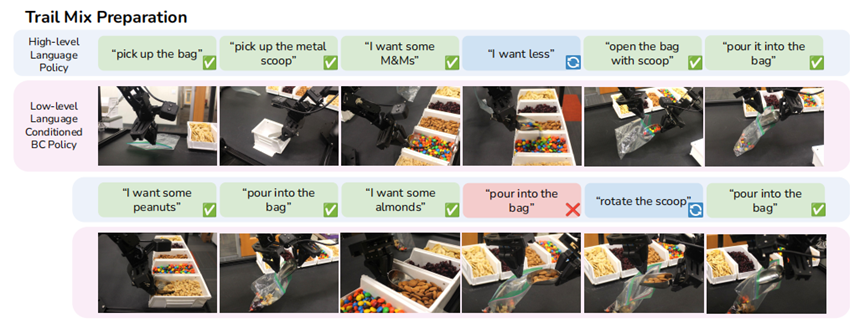 这时只要告诉它再把袋子打开一点点,机器人就“心领神会”,调整出了一系列后续动作,并最终成功完成任务。
