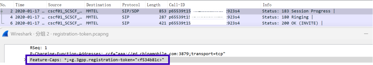 “g.3gpp.registration-token”也可包含在对被叫端的初始请求作出的 1xx 或 2xx 响应中,或者对独立事务请求作出的 2xx 响应中。 如下图所示: