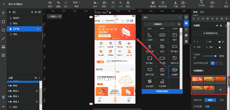 2、在云产品页面放入轮播图,调整大小,更换所需要的图片。