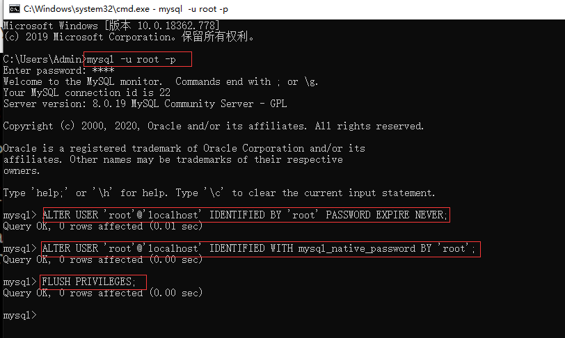 ALTER USER 'root'@'localhost' IDENTIFIED BY 'password' PASSWORD EXPIRE NEVER; #修改加密规则
